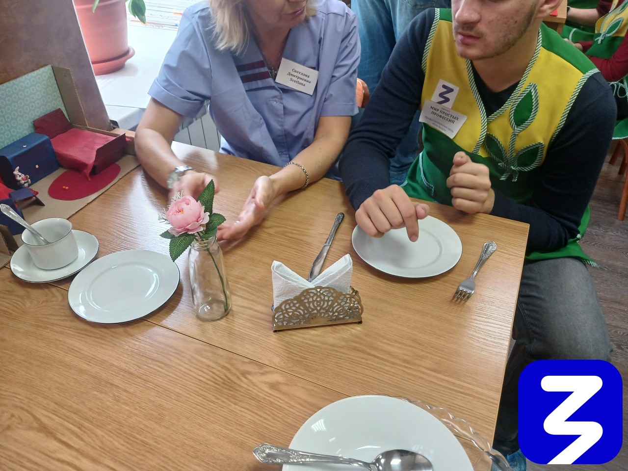 В рамках профпроб по профессии «Официант» ребята и педагоги обсуждали, какая посуда необходима для разных блюд, пробовали сервировать стол.