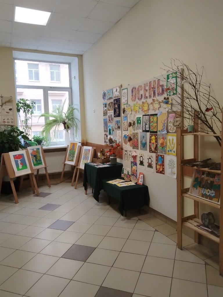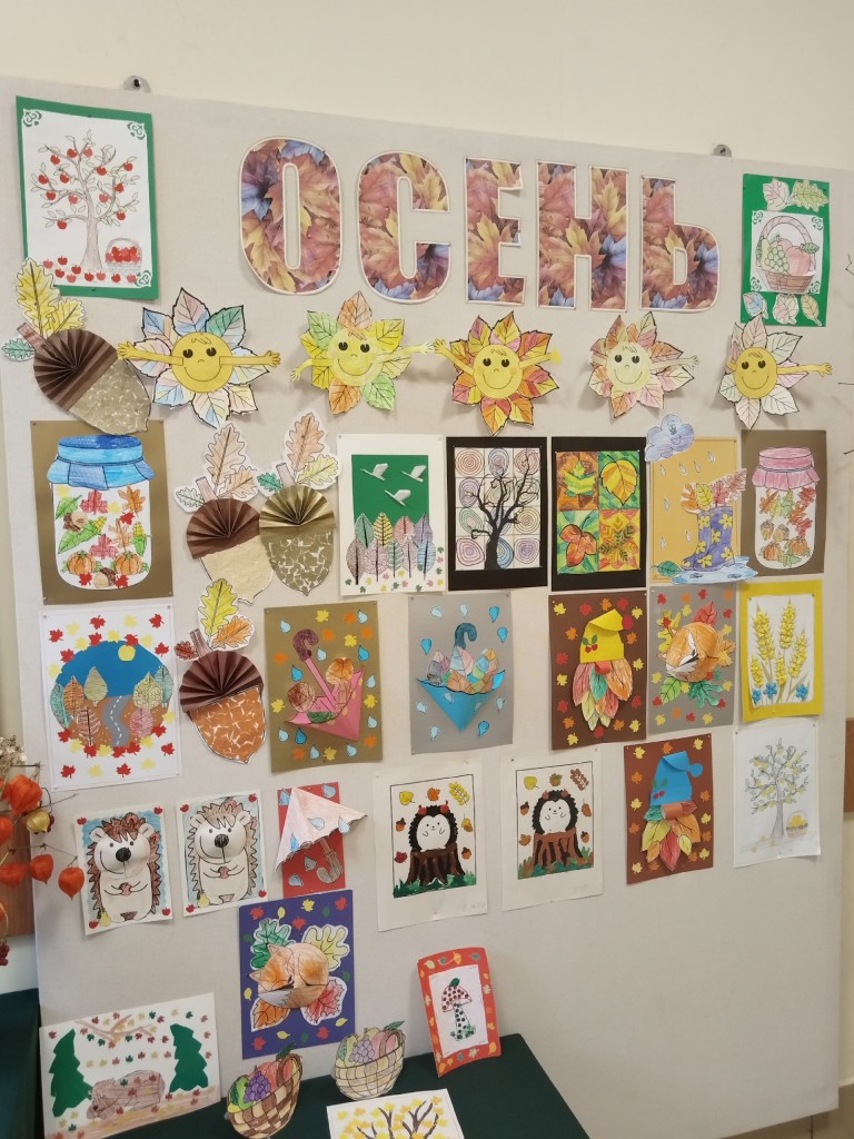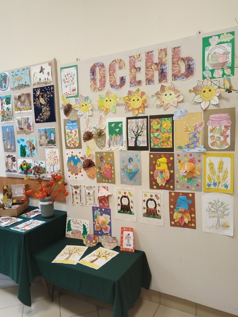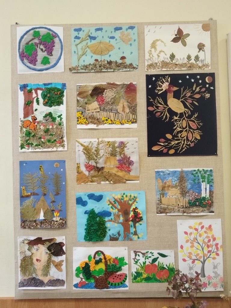 На выставке можно полюбоваться осенними натюрмортами, рисунками с лесными обитателями, аппликациями и композициями из природного материала.