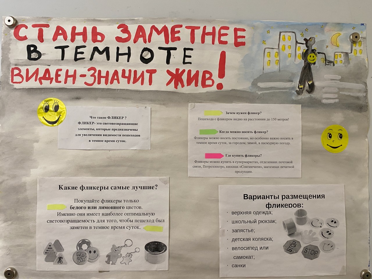 Для проведения акции юидовцы оформили тематическую газету. Совместно с руководителем отряда ЮИД Капустиной Екатериной Владимировной школьники провели беседы в классах «Как стать заметнее, используя светоотражающие элементы», на которых дарили ребятам светоотражающие брелоки.